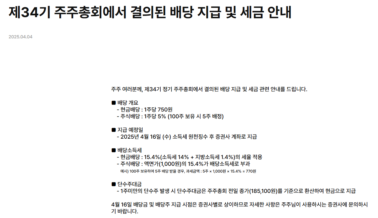 다음은 2025년 4월 4일에 올라온 셀트리온 공지사항 내용입니다.