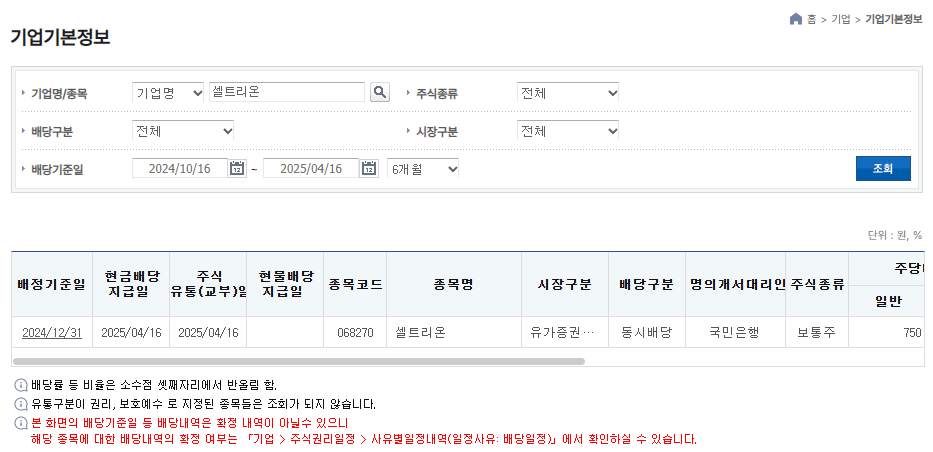 2024년 배당일 기준 셀트리온 배당금은 750원입니다.