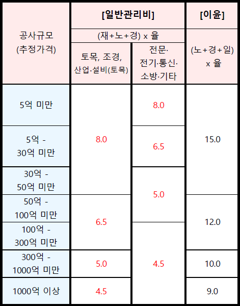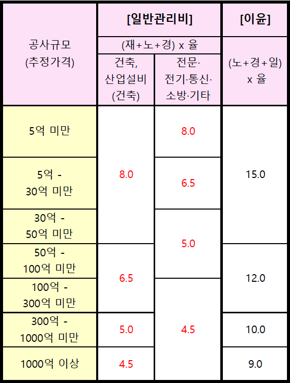 일반관리비 기본요율이 건설공사의 경우 5억미만 공사가 6% →8% 로 변동된 것을 포함하여